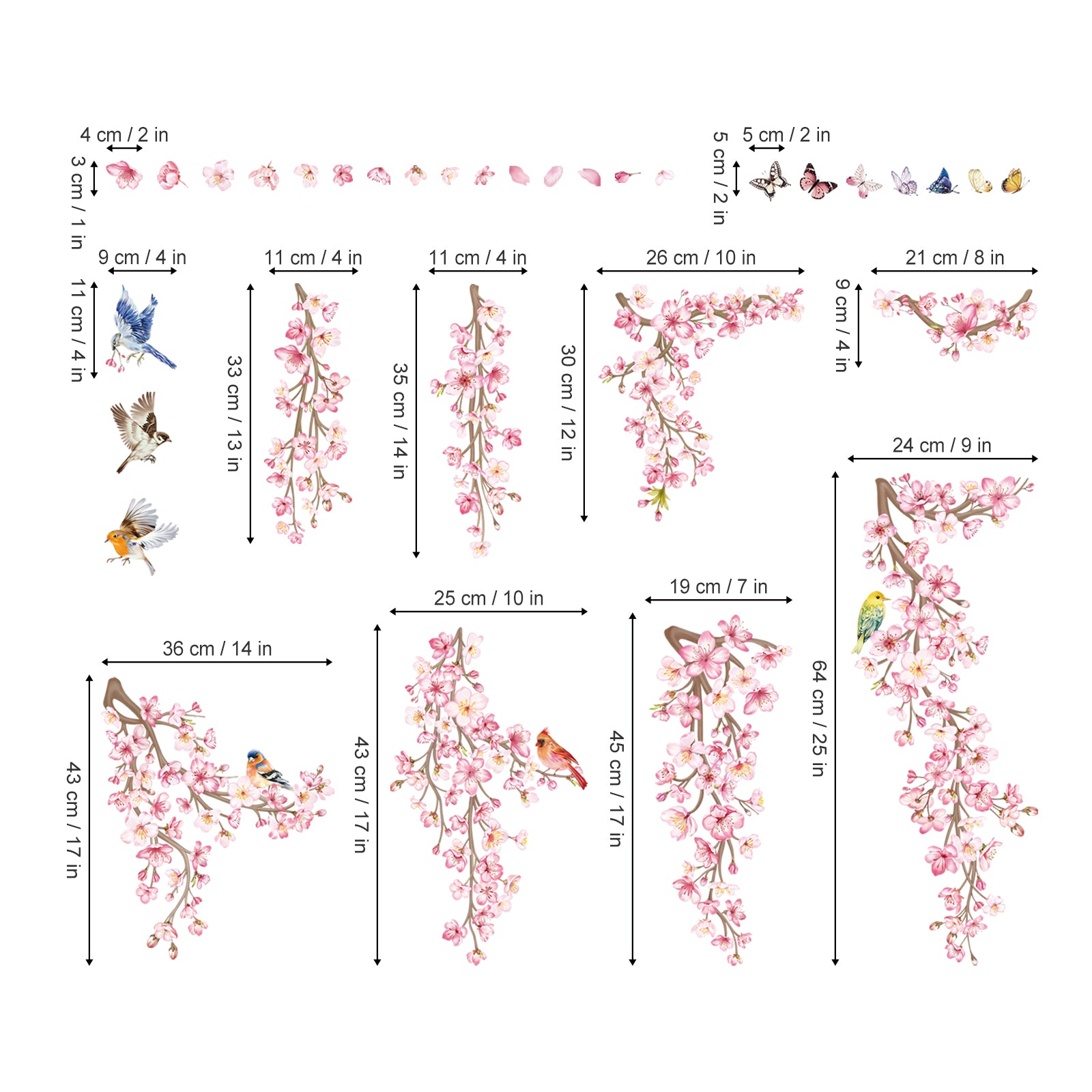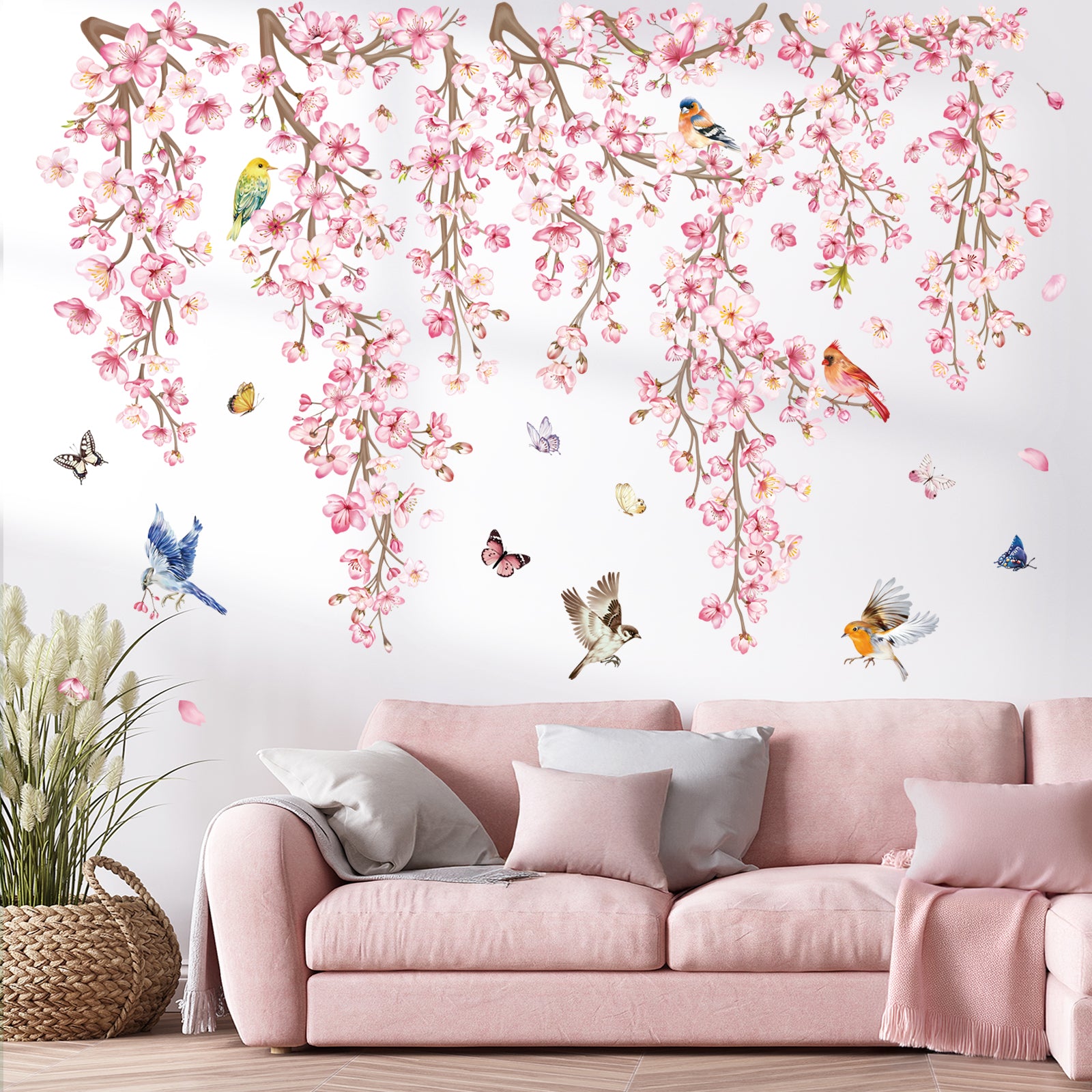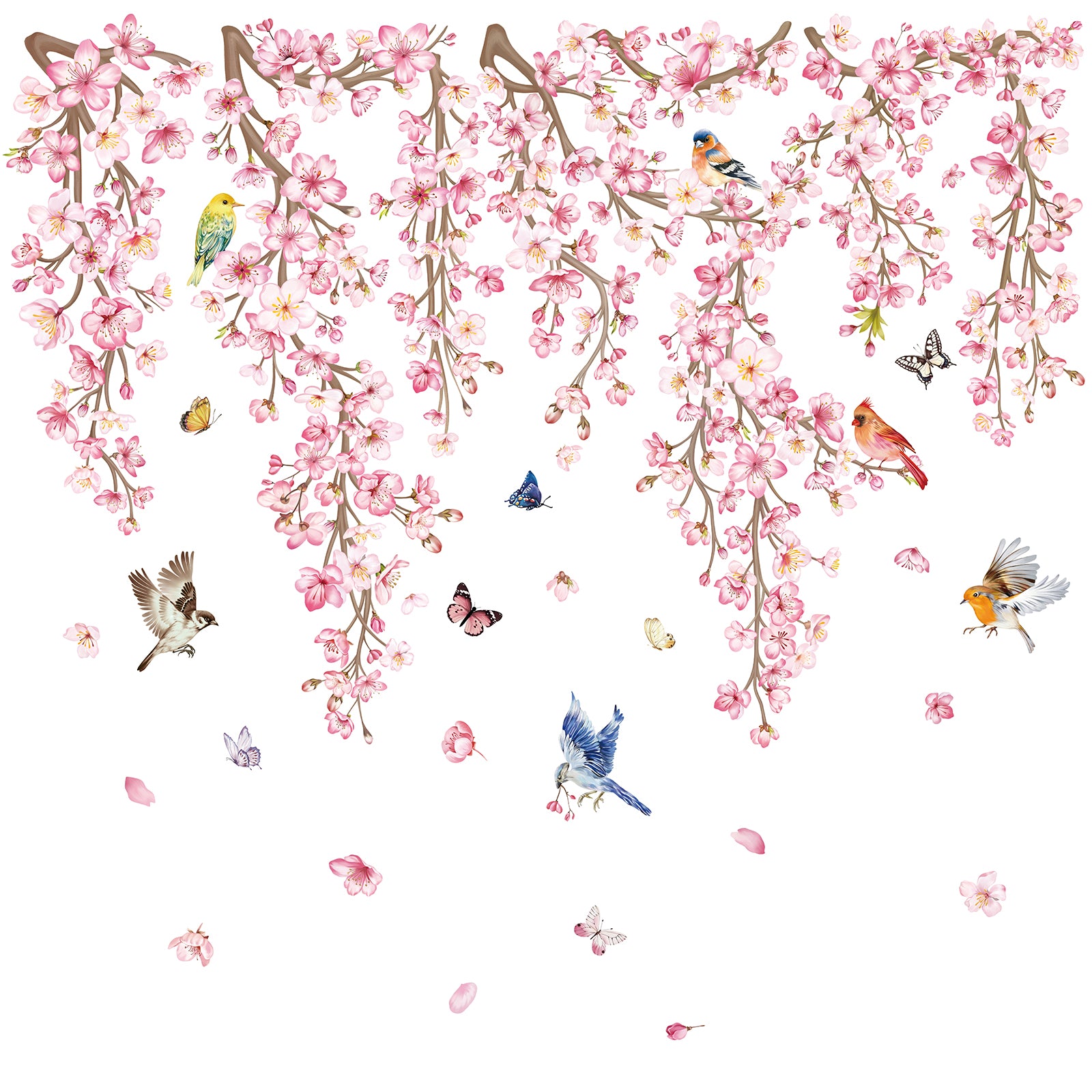 wondever Cherry Blossom Flower Vine Wall Stickers Pink Hanging Floral Tree Branch Birds Peel and Stick Wall Art Decals for Bedroom Living Room Sofa