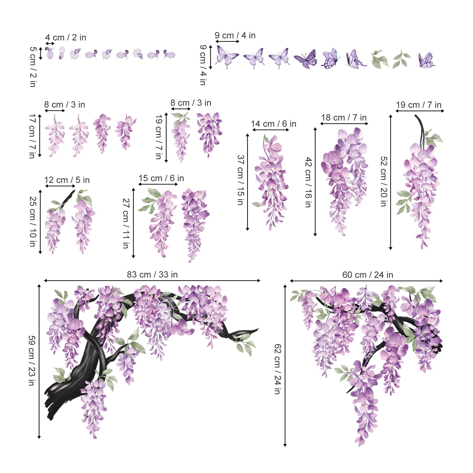 wondever Large Flower Tree Branch Wall Stickers Purple Hanging Vine Floral Butterflies Peel and Stick Wall Art Decals for Living Room Bedroom TV Wall
